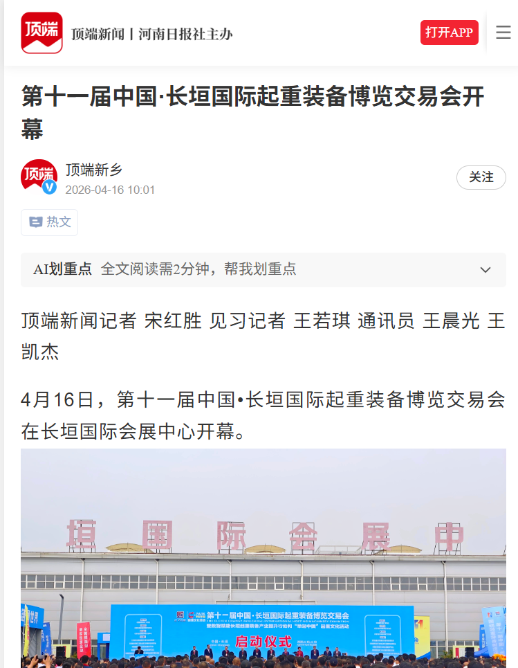“我们将以本次展会为契机,加快推动起重装备智能化、制造服务化、生产绿色化、管理数字化转型,全力打造桥门式起重机国际生产基地。”长垣市有关负责人表示,该市将依托坚实的产业基础,进一步加快“二次创业”,力争在“十五五”末建成“千亿县”和现代化中等城市,为国家制造业高质量发展、为全省深入践行“两高四着力”贡献长垣力量。